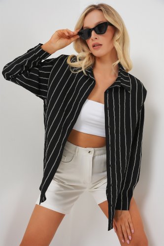 Önü Fiyonk Detaylı Düğmeli Kolu Lastikli Bluz Siyah