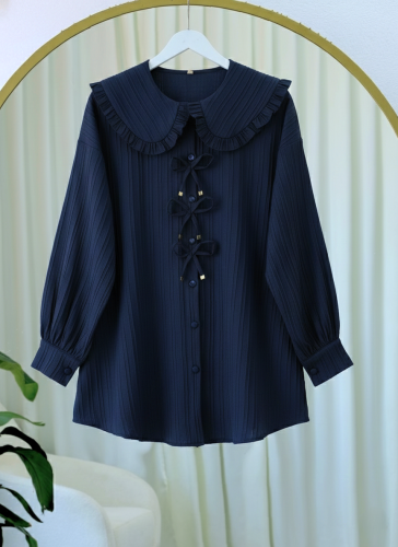 Önü Fiyonk Detaylı Düğmeli Kolu Lastikli Bluz Mavi