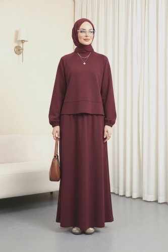 Yuvarlak Yaka Yarasa Kol Beli Lastikli Etekli Oyşo Takım Bordo