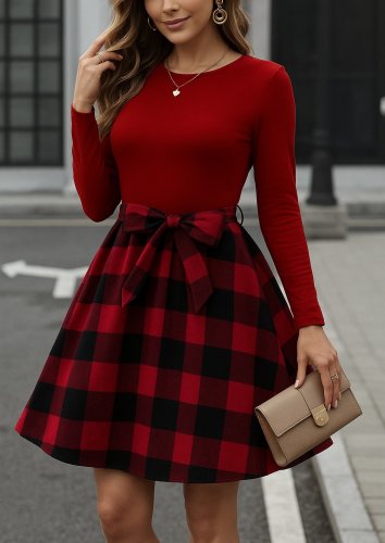 Kadın uzun kollu bisiklet yaka üst viskon alt ekose kısa elbise