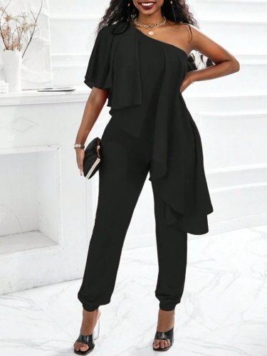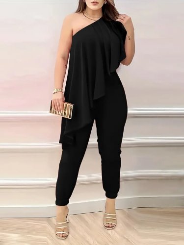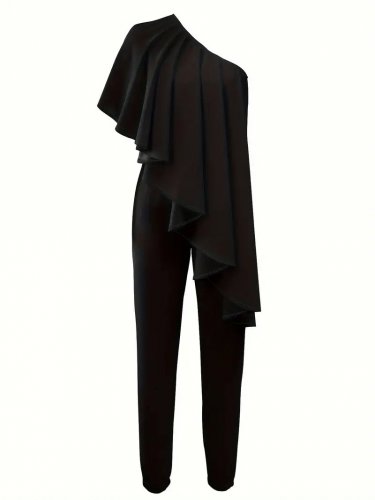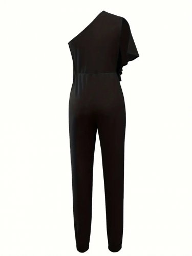 Kadın kolsuz tek omuzu açık önünde volan detay sandy tulum