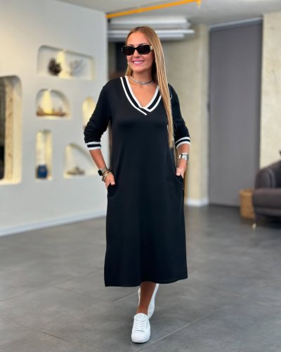 • Kadın uzun kollu v ribana yakalı yanlardan yırtmaçlı midi viskon iki iplik elbise