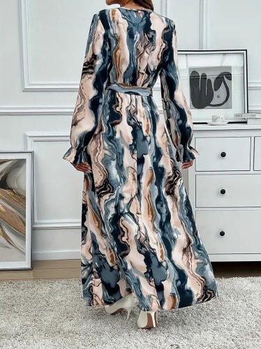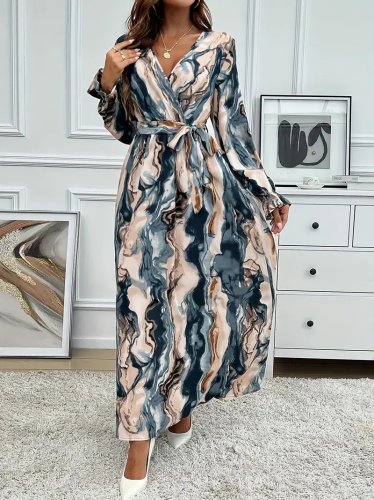 • Kadın uzun kollu kruvaze yakalı beli kuşaklı desenli süprem maxi elbise