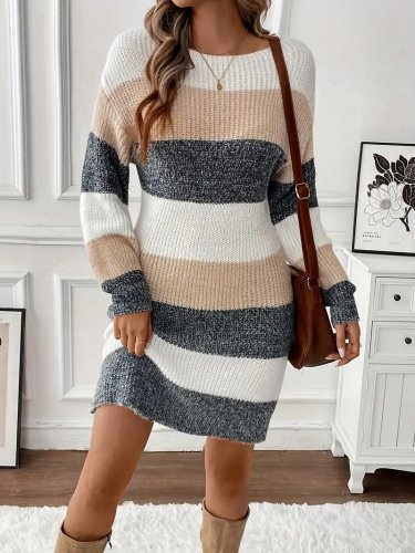 • Kadın uzun kollu yuvarlak yaka çizgili çok renkli triko elbise