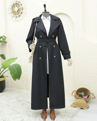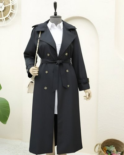 • Kolu Ve Omuzu Apoletli Cepli Uzun Trençkot Siyah