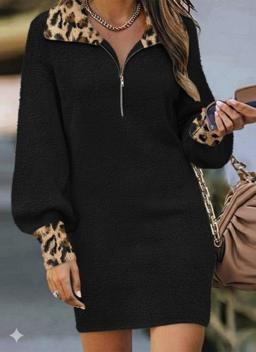 • Kadın uzun kollu yakalı önden fermuarlı leopar detaylı mini peluş elbise