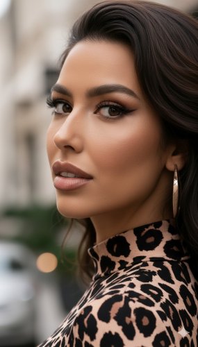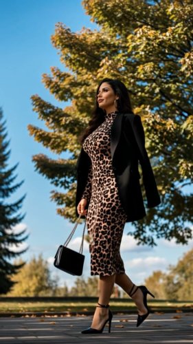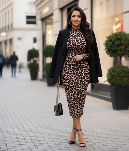 • Kadın uzun kollu balıkçı yaka leopar desenli midi boy elbise