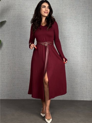 • Kadın uzun kollu yakalı belden deri detaylı kuşaklı yırtmaçlı midi viskon iki iplik elbise