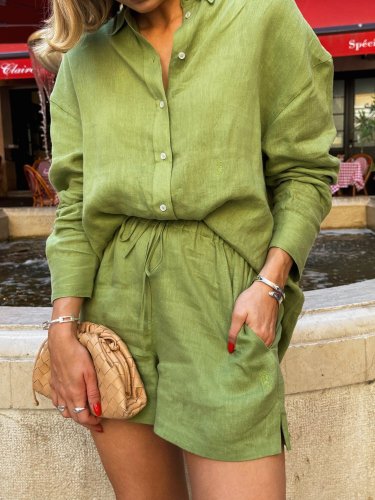 • Kadın uzun kollu salaş gömlek ve şort keten ikili takım