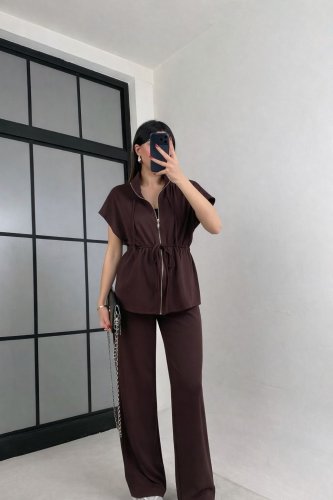 Kadın yarasa kol fermuar ve lastikli bağcık detay ceket pantolon ikili takım