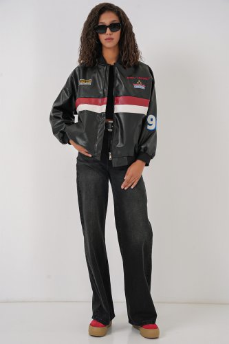 0698 Baskılı Suni Deri Bomber Ceket Siyah