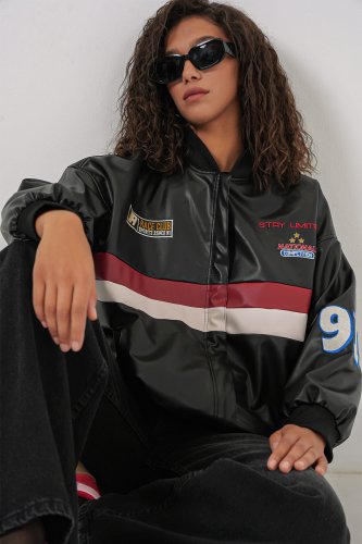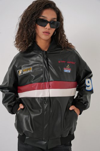 • 0698 Baskılı Suni Deri Bomber Ceket Siyah