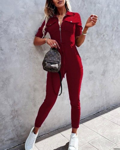 Kadın cep detay fermuar dekolteli kuşak dahil krep kumaş tulum