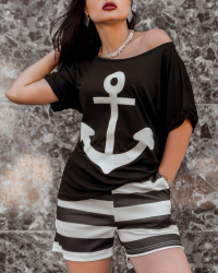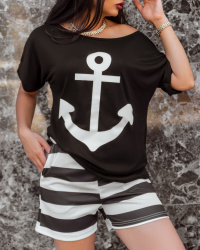 Kadın üst çıpa baskılı kayık yaka salaş viskon bluz alt şeritli krep şort takım