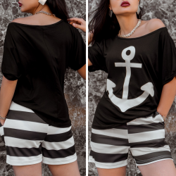 • Kadın üst çıpa baskılı kayık yaka salaş viskon bluz alt şeritli krep şort takım